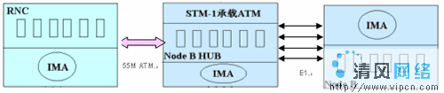 第二种接口和传输解决方案:根据现实情况,3G网络在接口上发生了很多变化,IMA是解决传输接口方法之一,IMA通过155M接口ATM信元反向复用封装在E1中,在E1内部实现信元的统计复用,如图2所示。