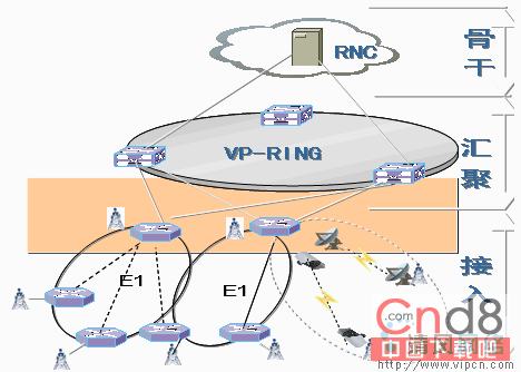 在NodeB HUB(普通NodeB内置一个基于AAL2的ATM交换单元)中,对外围基站接入的IMA E1进行转换,多个E1统计复用为ATM 155M接口,然后与RNC互通,解决RNC提供E1能力不足的问题,同时也避免了外围基站覆盖时的155M压力。但是,这种方案也带来其它传输问题,NodeB HUB由于机房条件的限制,考虑到安全因素,不可能带太多的外围NodeB,若带外围NodeB数量为5-6个,对于一个较大城市(3G频率高于GSM,基站数量不少于GSM,假设较大城市NodeB接入点为500个),NodeB HUB的数量超过80,这就意味着RNC到NodeB HUB层面需要有80个155M接口需要传送,透传和光纤直连显然不可取,城域网MSTP的ATM VP-Ring功能可成功解决这一问题。