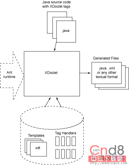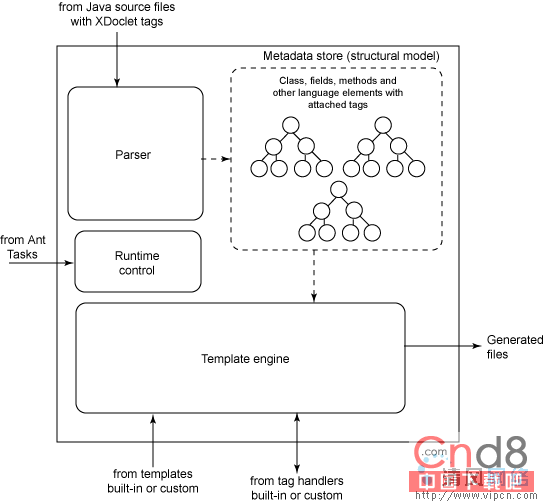 图 3 显示了 XDoclet 的内部结构,揭示了使其运行的功能块。