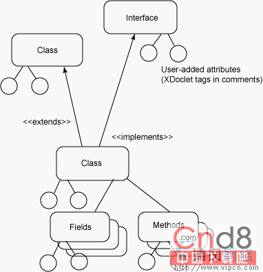 XDoclet 对包含嵌入式 XDoclet 标签的输入 Java 源代码进行解析,并为代码建立非常具体的结构模型。结构模型中的每个元素都代表源代码中的一个 Java 结构。图 2 显示的结构模型,揭示了 XDoclet 跟踪的代码构造和关系。