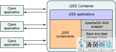 ApacheDS 实现服务器端 JNDI.这意味着它包含的类,实现的是对目录操作请求进行响应的 JNDI 接口。正如前面指出的(如 图 1 所示),J2EE 容器可以通过 ApacheDS 的 JNDI 包装器利用它的目录服务。