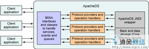 可以看到,ApacheDS 使用一套叫做多用途网络应用程序接口(MINA)的接口。MINA 支持把新的协议实现插入 ApacheDS.在介绍这些内容之前,我要解释一下 MINA 的工作方式。