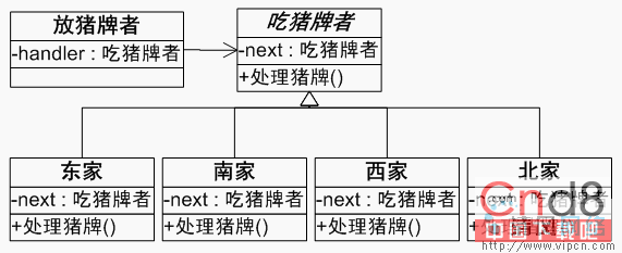 首先,在“猪”牌放出之后,每个人都只能要么躲过“猪”牌,要么吃住“猪”牌。“猪”牌便是责任链模式中的请求,四个人便是四个处理者对象,组成责任链。
