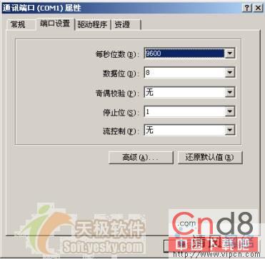 (2) 初始化串口,设置波特率、数据位、停止位、奇偶校验等参数。为了给读者一个直观的印象,下图从Windows的"控制面板->系统->设备治理器->通信端口(COM1)"打开COM的设置窗口: