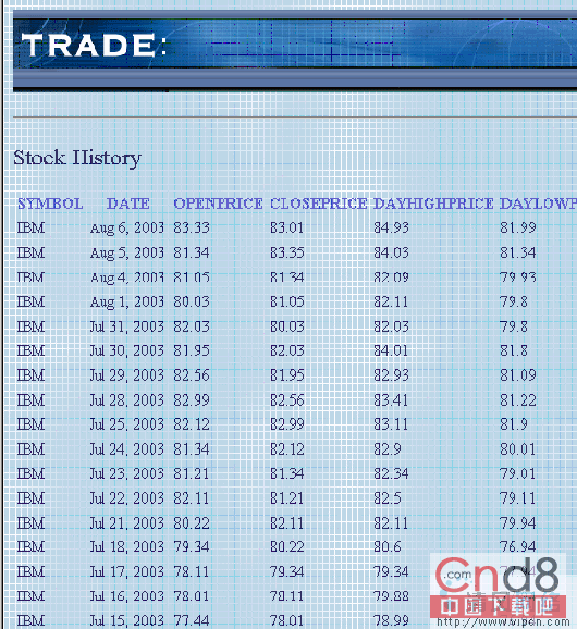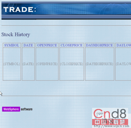 屏幕看起来如图 32 所示。您也可以预览此页面。 图 32. 页面预览 设置 JSF 导航 我们现在已经创建了 Stock History 页面,现在需要从 AccessStockHistory.jsp 定义导航规则。WebSphere Studio 使用 A