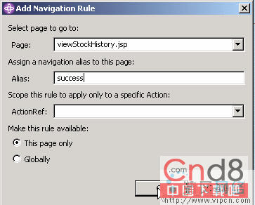 从 Page 下拉框中选择 viewStockHistory.jsp(图 36)。Page 定义了此控件将转到的页面。为 Alias 选择 sUCcess。确保选取了 This page only,然后按下 OK。只要碰到了 success,此 faces Servlet 都将转到 viewStockHistory.jsp。此 success 字符串可以作为操作的结果返回,或者在提交时隐式设置为一个缺省值。