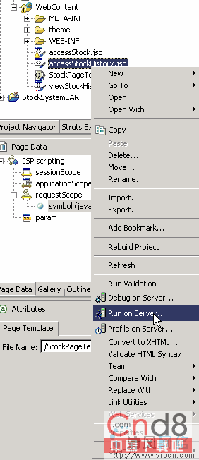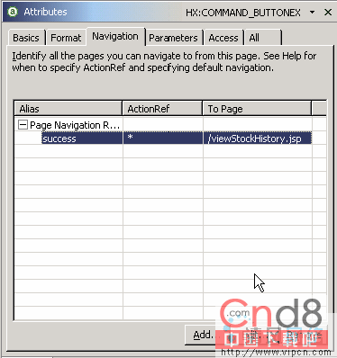 我们现在已经创建了 Stock History 页面,现在需要从 AccessStockHistory.jsp 定义导航规则。WebSphere Studio 使用 Attribute 视图来完成这一工作。