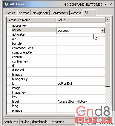 当 accessStockHistory.jsp 在编辑器中还处于活动状态时,在 Attributes 视图中选择 All 选项卡输入 success 作为 action。