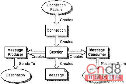图1显示了JMS对象,用于提供JMS客户端与JMS服务提供者相连的对象。