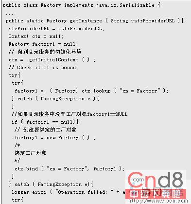 Singlton模式的实现可以利用JNDI名字服务来实现。在名字服务中存放Singlton模式中的惟一实例,使用者要使用这个实例可以使用JNDI编程接口查询这个对象。我们的工厂类对象的产生就可以采用这个方法。