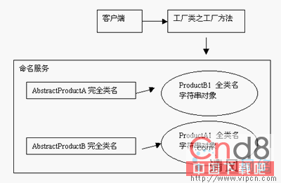 1.图8表示在工厂类的工厂方法要求创建产品族1时,可以在目录服务中指定抽象产品的完全类名绑定到产品族1的相应类名上。