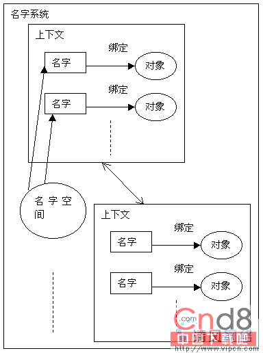 一个名字系统由相互联系的一系列上下文组成,上下文是名字与对象的绑定集合,相互联系的一组上下文能形成一个层次结构。一个名字系统中所有的名字组成了这个系统的命名空间,而且命名空间有它自己的命名规范。一个目录库由一系列目录对象组成,每个目录对象可以有若干个属性相连。