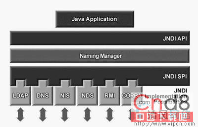 1.JNDI架构如图5,其中JNDI SPI为服务提供者接口,LDAP、DNS、NIS等为服务提供者,JNDI API为客户程序使用服务的编程接口。