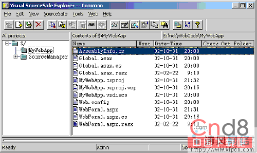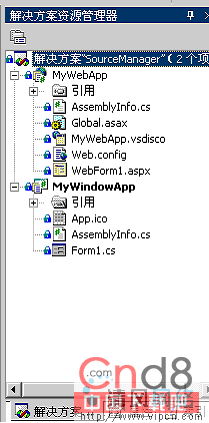 10、 到此,我们已经在SourceSafe中添加了整个解决方案,包括一个Windows应用程序和一个Web应用程序。在"解决方案资源治理器"视图中,加入源代码控制的程序旁边有一把锁(如图九所示),表示文档已签入,不可编辑。