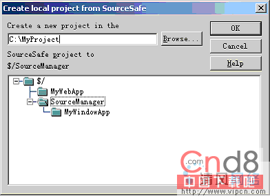 2、 弹出"Create local poject from SourceSafe"窗口,在"Create a new project in the"输入框中填写你要保存项目的本地路径,这里我们选择"C:MyProject"。在"SourceSafe project to"中选择SourceManager项目,单击OK按钮。假如目录C:MyProject不存在,会询问是否创建,选择"Yes All"。