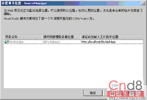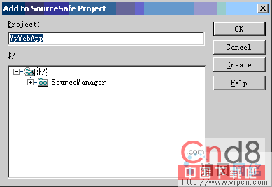 9、 接下来会让你选择Web应用程序的保存位置。如下图所示。由于Web应用程序通常保存在本地的IIS根目录下。与解决方案中的其它项目不在同一个目录中,所以需要为Web应用程序在SourceSafe中单独建立一个项目。在该窗口点击"OK"按钮接受SourceSafe的默认项目名称MyWebApp。