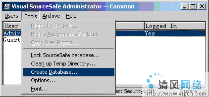 2、 在Visual SourceSafe Administrator窗口中,你可以看到Source Safe默认的两个用户Admin和Guest。假如你不打算使用默认的Common数据库,而要建立一个属于自己的项目数据库。选择菜单"Tools"――"Create Database",如图二所示: