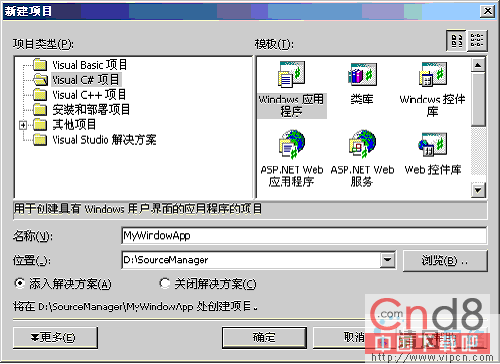 3、 使用"文件"――"新建"――"项目"命令,在项目类型中选择"Visual C#项目",在"模板"中选择"Window应用程序"。项目名称MyWindowApp。并选择"添入解决方案"选项。确定。
