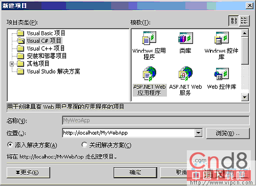 4、 使用"文件"――"新建"――"项目"命令,在项目类型中选择"Visual C#项目",在"模板"中选择"Asp.Net Web应用程序"。在"位置"栏中填写http://localhost/MyWebApp。并选择"添入解决方案"选项。确定。