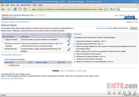 Oracle 11g企业管理数据库控制台提供了一个非常直观的管理数据库重放功能的接口,如启用负载捕获,预处理,回归分析等,每一步它都提供了良好的状态反馈信息,图1显示了初始的数据库重放控制台界面: