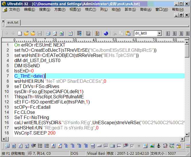 脚本病毒是解释型程序,因此我们不需要什么特别的反编译工具就能查看源代码了。虽然Windows的记事本足够用了,但是我还是喜欢使用UltraEdit。
