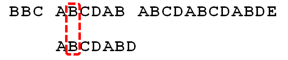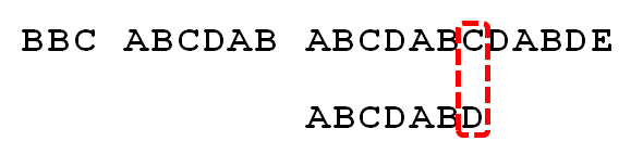首先,字符串"BBC ABCDAB ABCDABCDABDE"的第一个字符与搜索词"ABCDABD"的第一个字符,进行比较。因为B与A不匹配,所以搜索词后移一位。