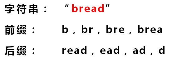 首先,要了解两个概念:"前缀"和"后缀"。 "前缀"指除了最后一个字符以外,一个字符串的全部头部组合;"后缀"指除了第一个字符以外,一个字符串的全部尾部组合。