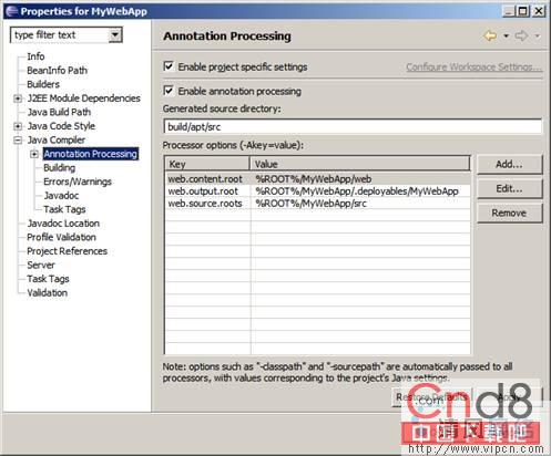 打开Web项目的Properties,在树型目录结构中找到Java Compiler -> Annotation Processing节点并选中,然后利用以下信息进行配置: