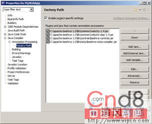 这是JDT APT的第二个配置点。它可以指定用于定位注释处理器的.jar文件等等。共有四个.jar文件需要添加至Factory Path配置以便支持Apache Beehive。
