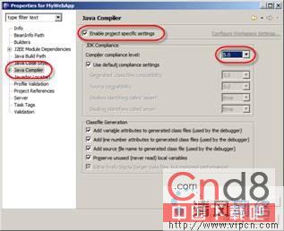打开Web项目Properties,找到Java Compiler,然后选中。选择Enable project specific settings,然后将Compiler compliance level设置为5.0。您会看到如下界面: