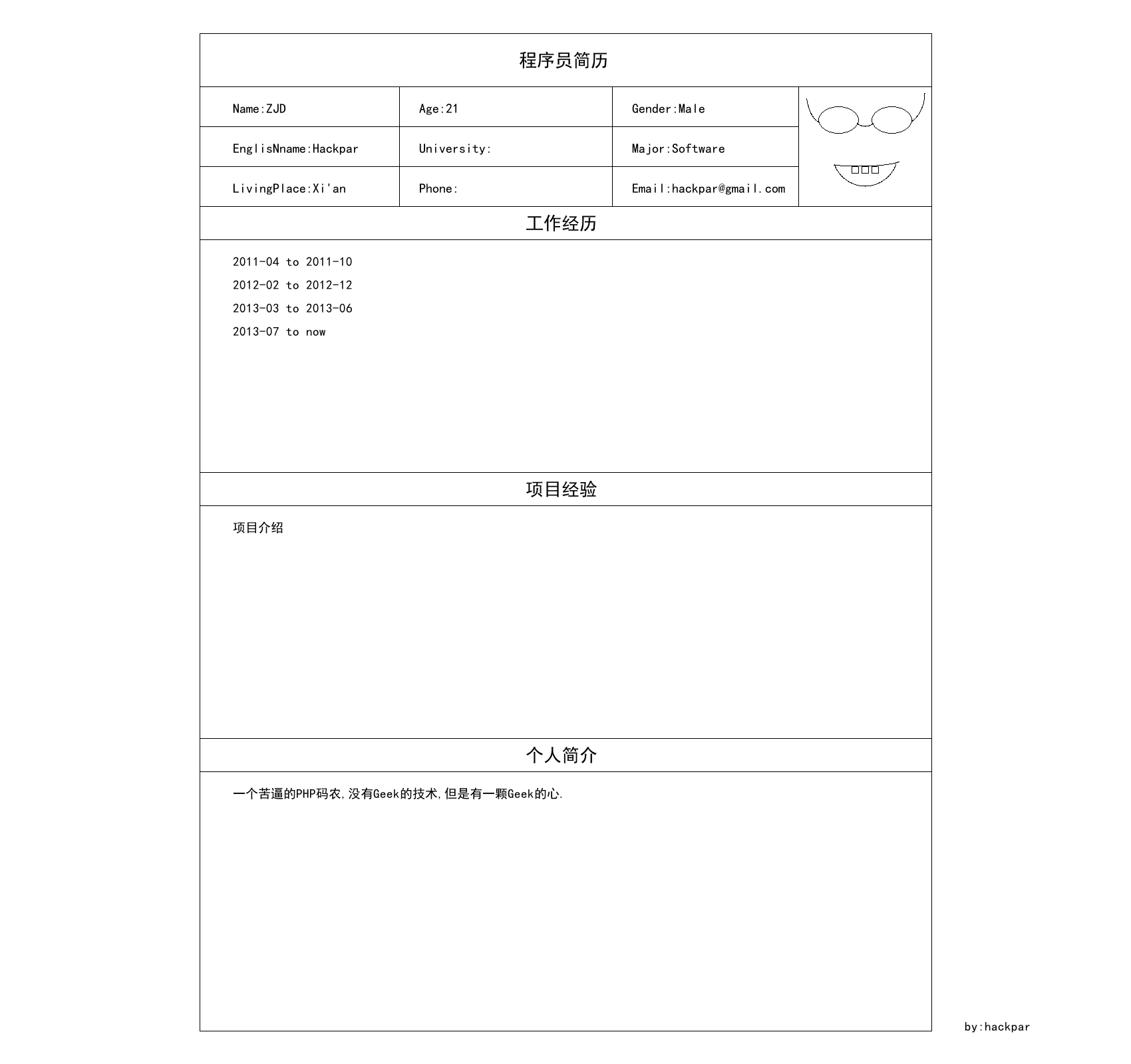 准备跳槽,开始写简历,看了那么多人的简历,总是千篇一律,既然是程序员,那么就用程序员的方式来做简历吧!