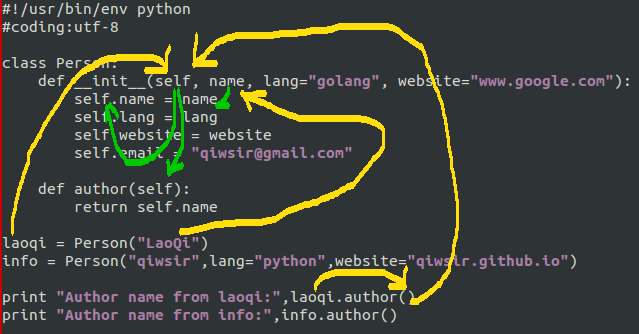 当运行laoqi.author()的时候,就是告诉上面的代码,调用laoqi实例对象,并得到author()方法的结果,laoqi这个实例就自动被告诉了author()(注意,self参数在这里不用写,这个告诉过程是python自动完成的,不用我们操心了),author方法就返回laoqi实例的属性,因为前面已经完成了laoqi与self的对应过程,所以这时候author里面的self就是laoqi,自然self.name=laoqi.name。