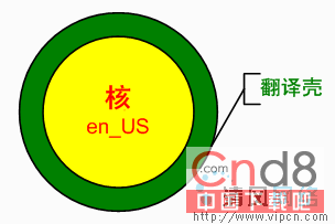 换言之,系统的内核可以是纯英文的;在内核外部增加一个壳层负责语言翻译工作。请见下面的概念图: