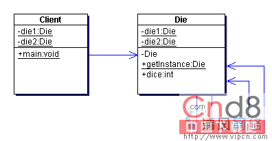 在多态类Die中,使用了饿汉方式创建了两个Die的实例。根据静态工厂方法的参数,工厂方法返还两个事例中的一个。Die对象的dice()方法代表掷色子,这个方法会返还一个在1到6之间的随机数,相当于色子的点数。