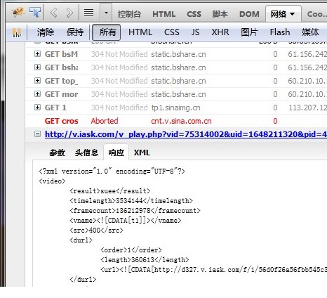 中得到的响应有我们想要的xml信息,其中vid就是上面红色部分,uid后面的都可以忽略,我们在浏览器中直接输入http://v.iask.com/v_play.php?vid=75314002还是可以得到相同的信息。自此解析的思路就变清晰了,在视频链接中提取出vid,使用http://v.iask.com/v_play.php?vid=得到xml文件,解析xml文件就可以得到真实视频地址了。