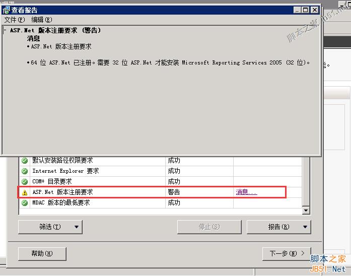 64位的ASP.Net已注册,需要32位的ASP.Net才能安装Microsoft Reporting services 2005 (32位)。