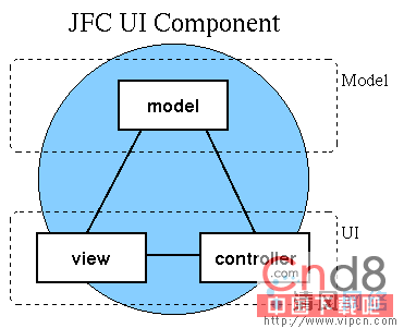 下面的图解释了如何把一个JFC开发的用户界面分为model,view,controller,注重,view/Controller被合并到了一起,这是MVC设计模式通常的用法,它们提供了组件的用户界面(UI)。