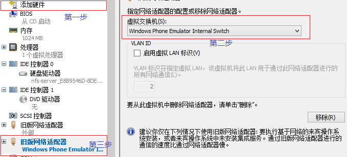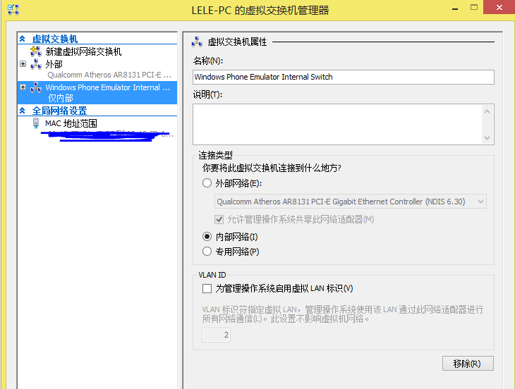 (1)、虚拟交换机中请务必要选择“内部”属性的适配器(在这里选择的是刚刚新建的那张,名为:“Windows phone ……”)