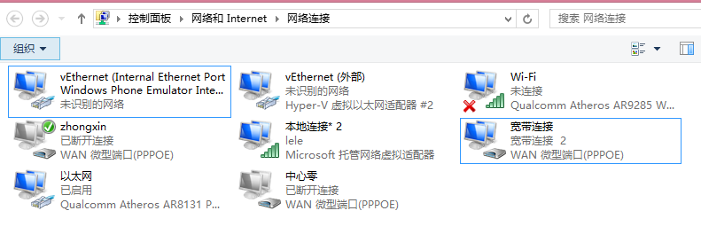 里面有非常之多的网络适配器,这些大家都不用管,只需要留意图中两个蓝色框起来的适配器,一个为“宽带连接”(也就是Windows中的宽带连接),另一个是“vEthement(Internal Ethernet……)”(也就是在Hyper-V中新建的那一张内部网络适配器)。