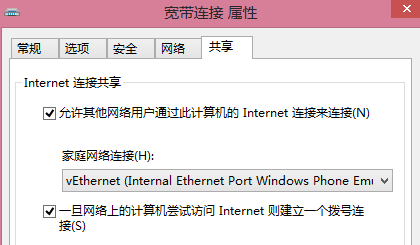在“宽带连接”中点击右键,选择“属性”,打开设置窗口,打开“共享”这个选项卡,勾上“允许其他网络用户通过此计算机的Internet连接来连接”,“家庭网络连接”这个下拉菜单中选择刚刚我们新建的“内部”网络适配器。