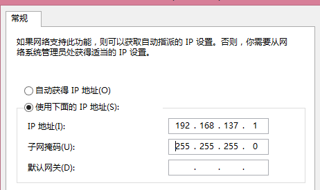 然后继续设置我们的“内部”适配器的IP,如图所示,只要随意的设置一个与宽带连接不同网段的IP即可