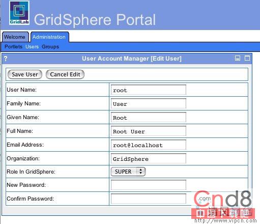 从 http://www.gridsphere.org 下载最新的 GridSphere 版本并按照指示安装该门户。前提条件是您必须在系统中安装了 Java 技术 Ant 和 Tomcat 4.1.X servlet 容器。安装了 GridSphere 后,可以只启动 Tomcat,然后在 Web 浏览器中,单击 http://127.0.0.1:8080/gridsphere/gridsphere 查看该门户。初始配置答应您以“root”身份登录,而且不用输入口令。登录后,转至 Administration->Users 选项卡,单击 root 用户来编辑配置文件。更改口令和其他设置,包括您的登录名和电子邮件地址。登录后,您就成为 GridSphere 门户治理员。