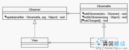Java通过专门的类Observable及Observer接口来实现MVC编程模式。其UML类图及MVC模式的实现方式见图2。