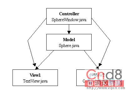 该程序主要由三个类构成,分别为Sphere类、TextView类及SphereWindow类。其中Sphere类扮演Model的角色,TextView类为View角色,SphereWindow类为Controller角色。