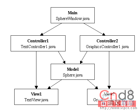 其中Model类及View1类根本不需要改变,与前面的完全一样,这就是面向对象编程的好处。对于Controller中的SphereWindows类,只需要增加另一个视图,并与Model发生关联即可。其要害实现代码为: