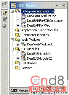 4.J2EE 1.3 项目:DualEARForWeb。此项目只预备用作 Servlet 容器。此外,我们还可以使用 DualEARForAllInOne 来达到相同的目的,因为它们惟一的不同之处在于项目依靠性。然而,最好保持它们分离。
