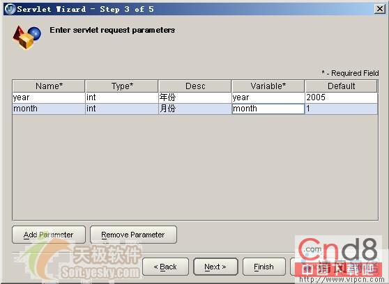点击Add Parameter在参数列表出现一个新行,在新行中定义Servlet的URL参数,其中Name为URL所带的参数名,而Variable为Servlet中对应的变量名,此外还可以通过Desc和Default为变量指定注释和默认值,在Type栏中指定变量的类型。