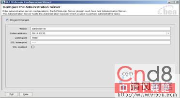 输入Administrator Server的名称,监听地址,监听端口,假如需要SSL支持的话可以在“SSL enabled”后面的复选取框上打勾,配置SSL监听端口,单击“Next”按钮