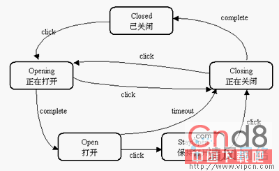当用户点击传送带的按钮时,传送带程序调用Door1对象的click()方法。click()方法模拟图1所示的状态装换过程: