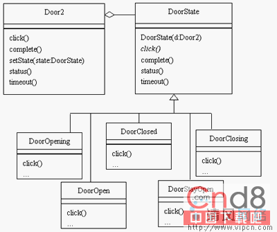 Door2类中的setState()方法现在由DoorState的子类调用。这些DoorState的子类与图1状态机中的相应实体很相似,例如,状态机中Open状态包含Timeout和Click,DoorOpen类则包含两个对应的方法timeout()和click()。DoorOpen类的代码如下: